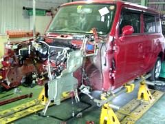 各パーツ脱着作業や大きな面積での塗装、妥協しない色合わせや塗装後の塗膜調整など、正確、丁寧に重点を置いた作業を心がけます。また、フレームが歪んでしまった大きな損傷に関しては、ボデーパネル交換作業やフレーム修正機等を使用した修理になります。