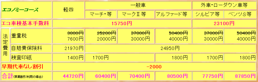 エコノミーコースの下記の基本手数料は初年度登録10年未満のお車になります。初年度登録から10年以上のお車は追加点検費用3,150円〜6,300円かかります。